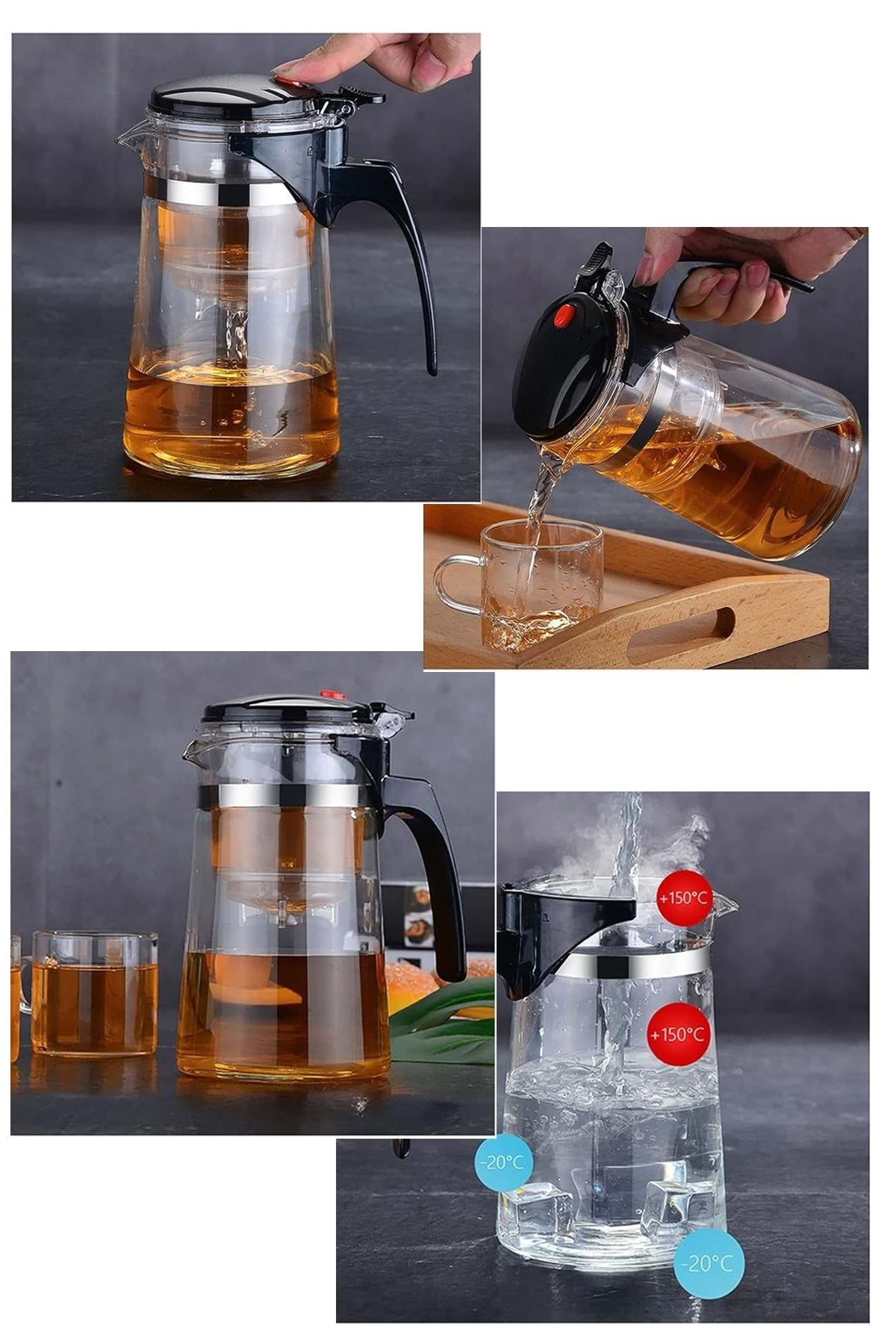 Isıya dayanıklı ve uzun ömürlü yüksek borosilikat camdan üretilmiştir. Filtre ve diğer metal parçalar ise çayınızın saflığını ve lezzetini korumak amacıyla 304 kalite paslanmaz çelikten yapılmıştır.
